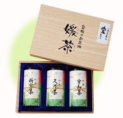 愛媛の3大茶処である「宇和・久万・新宮」の煎茶をギフトにしました。それぞれの産地の茶葉の形の味のちがいを楽しんでいただけます。